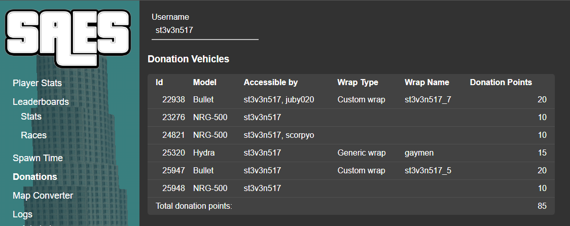 A Donations section has been added on SAES:RPG Web, this should give you a better overview of your current donation vehicles, wraps and donation points used. We plan on expanding this page with more information in the future to provide an even better overview of your donation rewards! This page will also allow SAES staff members and up to view donations for a certain user, giving them more tools to help the community with!